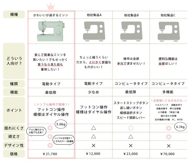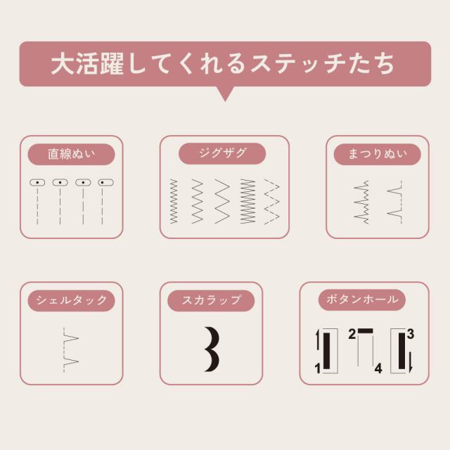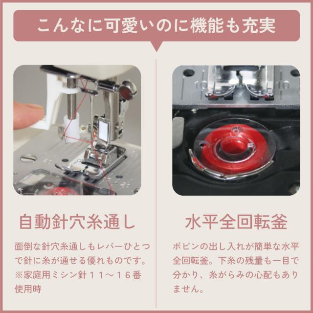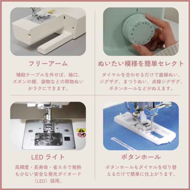自動針糸通し、水平全回転釜、模様簡単セレクト、フリーアーム、ボタンホール、手元LEDランプ内蔵、ステッチ16種類、パワフルモーター内蔵