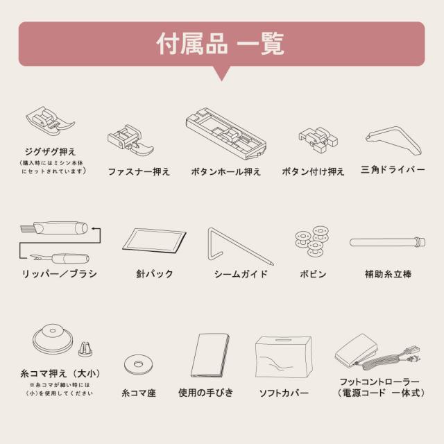ジグザグ押え、ファスナー押え、ボタンホール押え、ボタン付け押え、ボビン3個、糸コマ押え(大・小)、ドライバー、リッパー/ブラシ、針パック、シームガイド、補助糸立棒、糸コマ座、使用の手びき、ソフトカバー、フットコントローラー