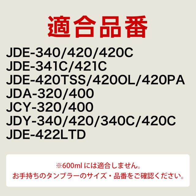 | 適合品番 | こちらのページは【320〜420mlサイズ専用】です。 600mlには適合しておりませんので、お手持ちのタンブラーのサイズ・品番をご確認ください。 JDE-340/420/420C JDE-341C/421C JDE-420TSS/420OL/420PA JDA-320/400 JCY-320/400 JDY-340/420/340C/420C JDE-422LTD |