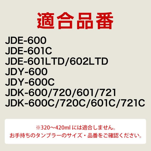 | 適合品番 | こちらのページは【600mlサイズ専用】です。 320〜420mlには適合しておりませんので、お手持ちのタンブラーのサイズ・品番をご確認ください。 JDE-600 JDE-601C JDE-601LTD/602LTD JDY-600 JDY-600C JDK-600/720/601/721 JDK-600C/720C/601C/721C |
