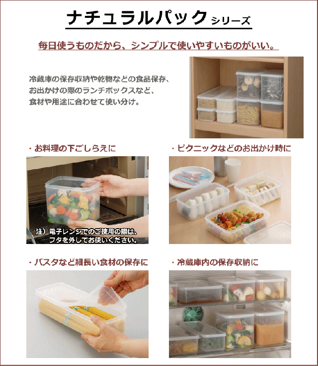 ・冷蔵庫の保存収納や乾物などの食品保存、お出かけの際のランチボックスなど、食材や用途に合わせて使い分け
