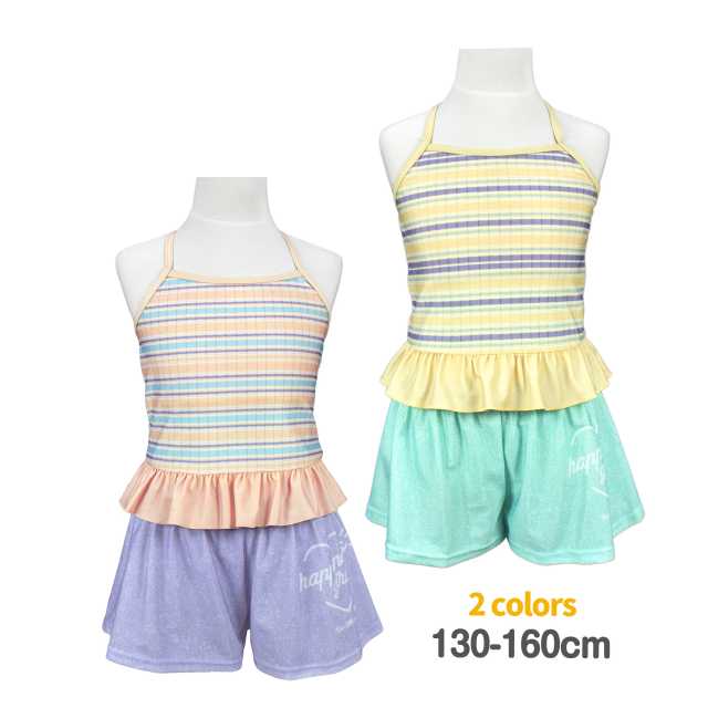 セットアップ 2点セット。マルチボーダー のトップスにインナーショーツ付きの キュロットパンツ のセットです。ボトムスはキュロットとショーツの一体型。腰には かわいい パッチ風チケット付き。トップスはストラップの長さ調節可能。