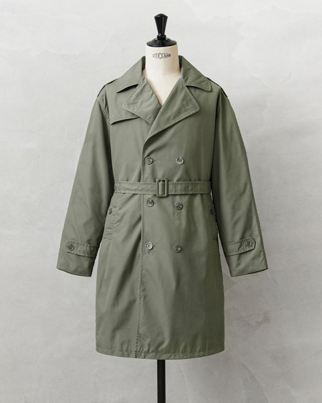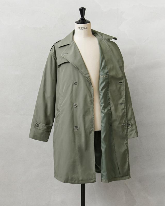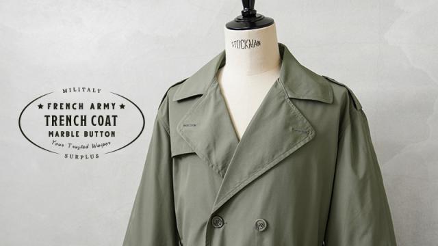 フランス軍の実物オフィサートレンチコートが入荷しました。一般的に知られているフランス軍のトレンチコートは、米軍のアイテムでよく見られる、UFO型のファティーグボタンを艶ありにしたような光沢のあるボタンが使用されていますが、こちらにはマーブルボタンのようなデザインが採用され、色目は確かにフランス軍のトレンチコートですが、一部の部隊などに対して限定的に使用されたためか、細部の仕様は若干異なる特別な仕様のトレンチコートです。右肩のガンフラップや、ウエスト部分の特徴的なデザインのポケットなどフランス軍らしいクラシカルな雰囲気漂うディテールも魅力のトレンチコートです。