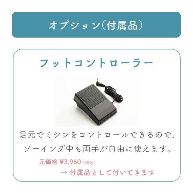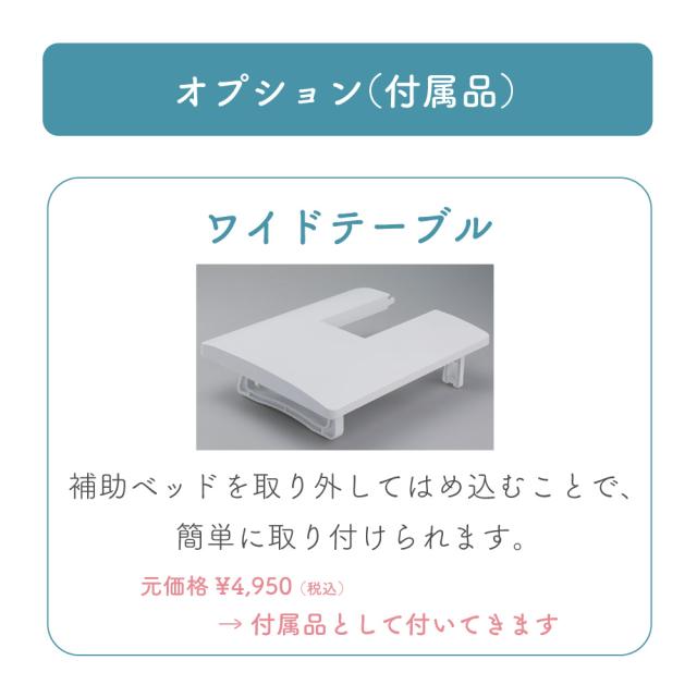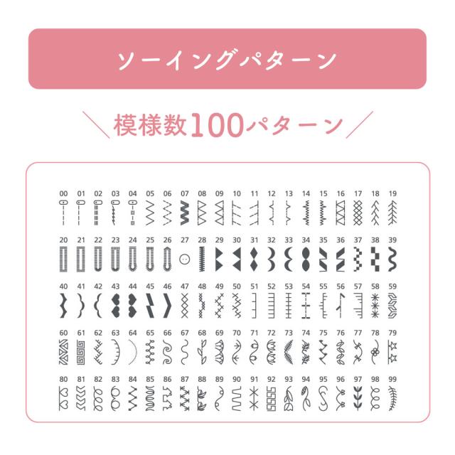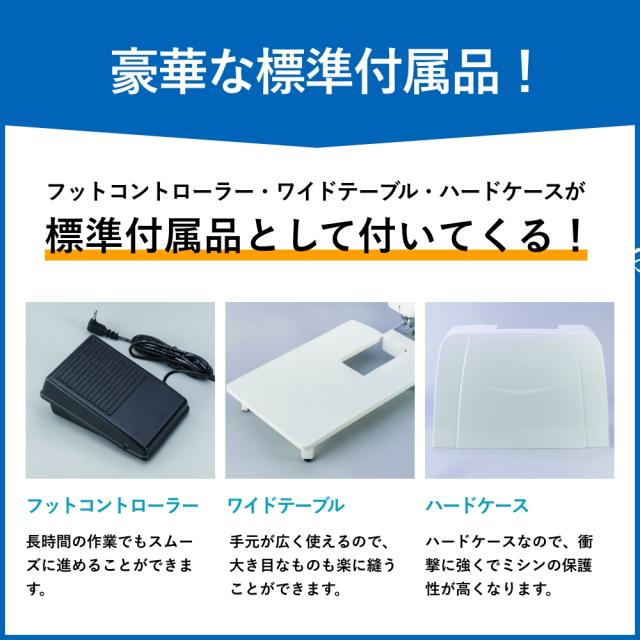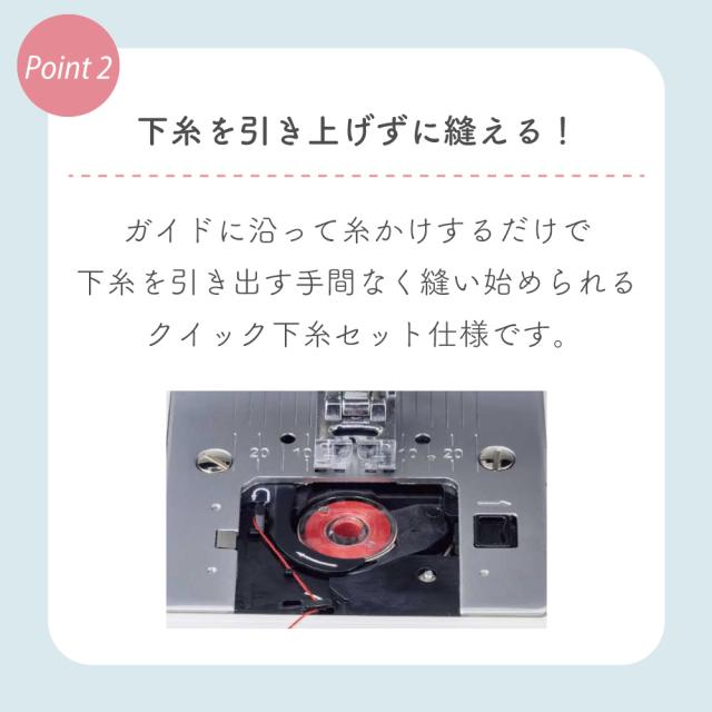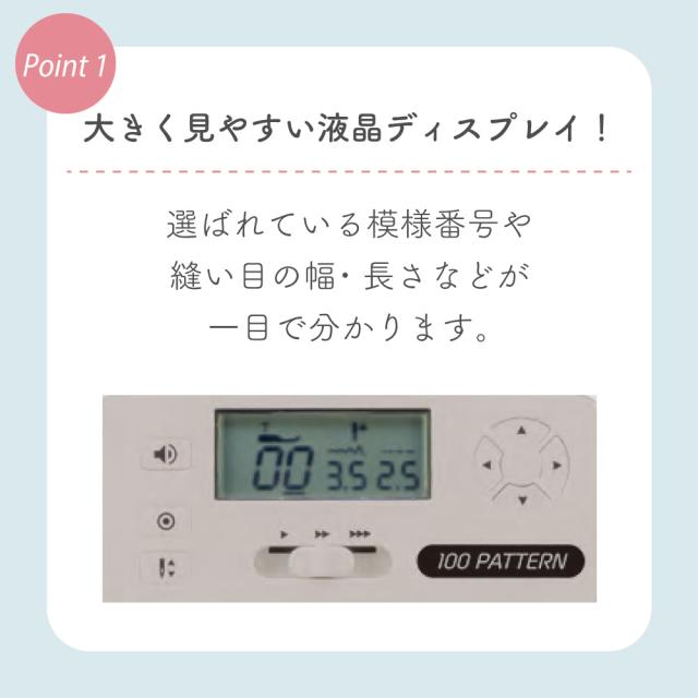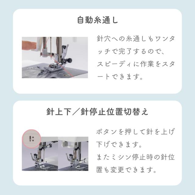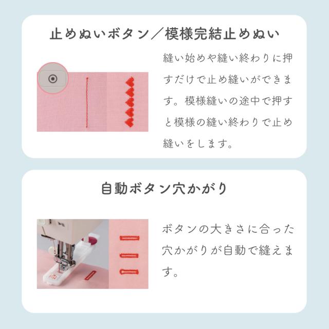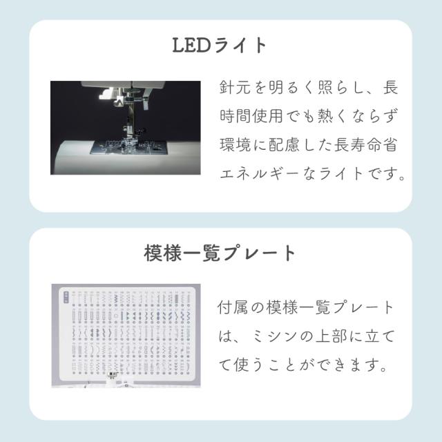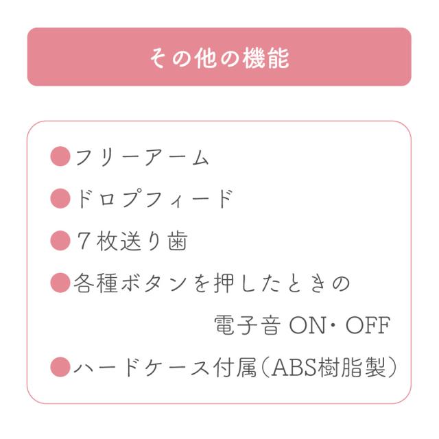 液晶ディスプレイ、クイック下糸セット、模様のサイズ変更、針基線位置変更、止縫いボタン、模様完結止めぬい、自動ボタン穴かがり、自動糸通し、オート糸調子、LEDライト、フリーアーム、ドロップフィード、7枚送り歯、各種ボタンを押したときの電子音ON/OFF