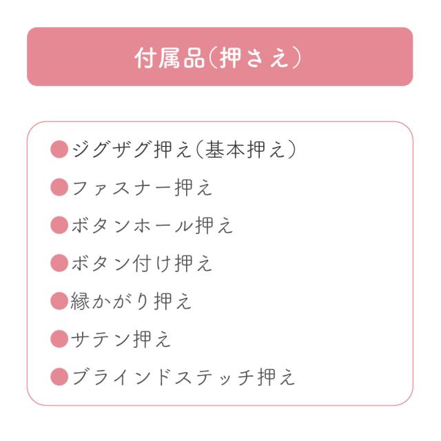 ジグザグ押え(基本押さえ)、ファスナー押え、ボタンホール押え、ボタン付け押え、縁かがり押え、サテン押え、ブラインドステッチ押え等