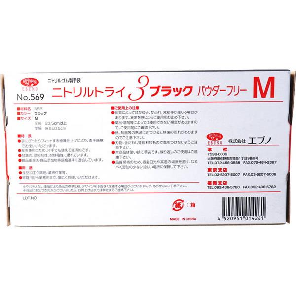 ゴム手袋 使い捨て 業務用 No.569 ニトリルトライ3 ブラック パウダーフリー ニトリルゴム製 Mサイズ 100枚入 左右兼用 食品衛生法適合