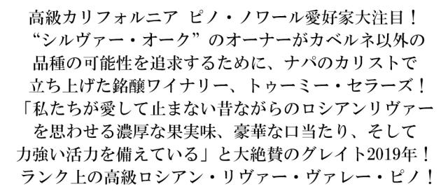 高級カリフォルニア ピノ・ノワール愛好家大注目! “シルヴァー・オーク”のオーナーがカベルネ以外の 品種の可能性を追求するために、ナパのカリストで 立ち上げた銘醸ワイナリー、トゥーミー・セラーズ! 「私たちが愛して止まない昔ながらのロシアンリヴァー を思わせる濃厚な果実味、豪華な口当たり、そして 力強い活力を備えている」と大絶賛のグレイト2019年! ランク上の高級ロシアン・リヴァー・ヴァレー・ピノ!