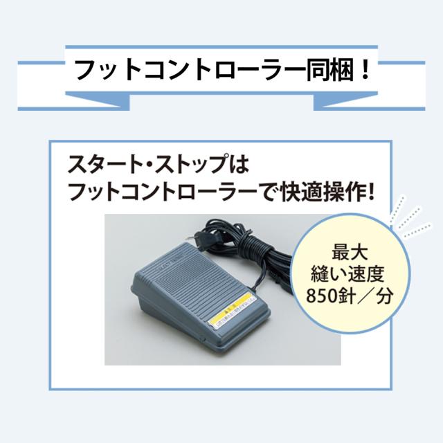 ジグザグ押え、たちめかがり押え、ボタンホール押さえ、ボタン付け押え、三角ドライバー、リッパー/ブラシ、針パック(HA×1 #14 3本)、ボビン4個、シームガイド、糸コマ押え(大・小)、補助糸立棒、糸コマ座、取扱説明書、ソフトカバー、フットコントローラー(電源コード一体式)
