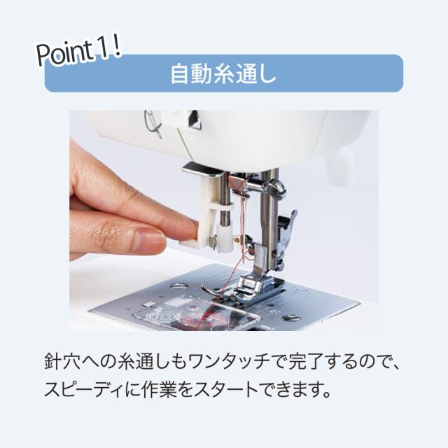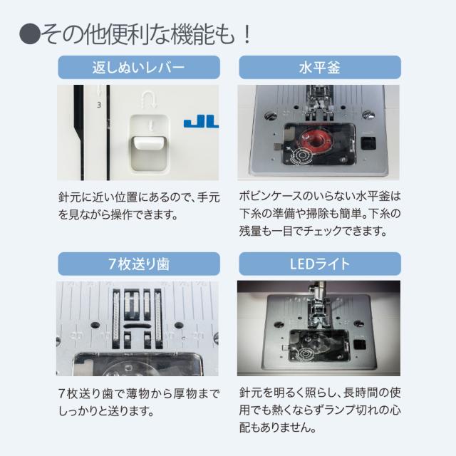 自動糸通し、押え圧調整、調節可能なふり幅/針落ち位置、返し縫いレバー、水平釜、自動ボタンホール、ボタン付け、7枚送り歯、LEDライト、フリーアーム、ドロップフィード、模様数34パターン