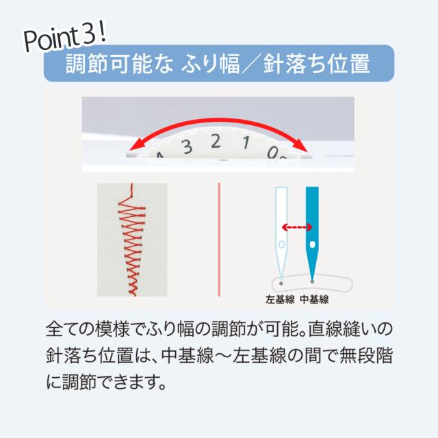 - JUKIのミシンを使ってみたかったのと、欲しい機能が揃っていたのでこちらの商品にしました。(縫い目の長さ、振り幅、針位置、オートボタンホール) まだ、試し縫いですが問題なく動いています。