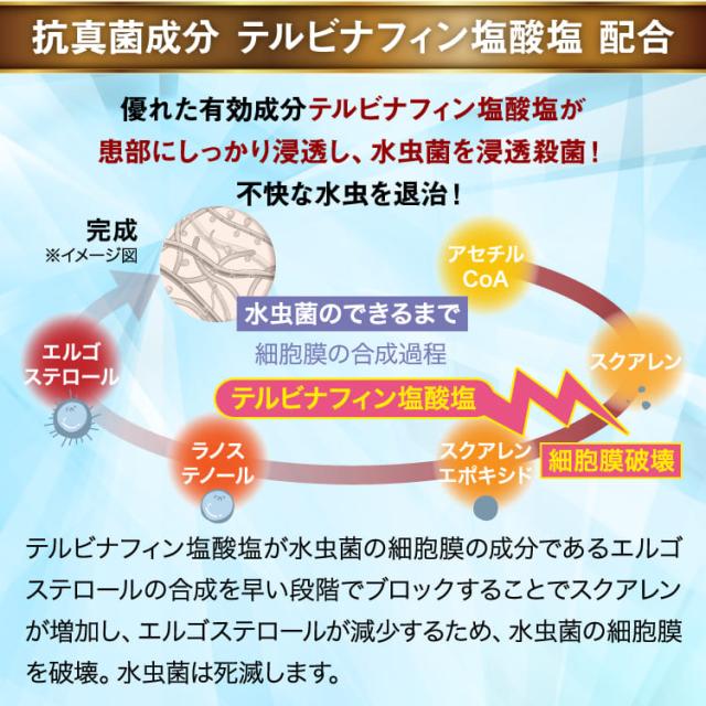 テルビナフィン塩酸塩 1g、リドカイン 2g、グリチルレチン酸 0.1g、尿素 10g、ジフェンヒドラミン 1g