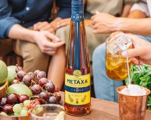 | 7年以上熟成させたメタクサ。 ブドウの蒸留液をまず樽で数年間熟成させ、その後、マスカット・ワインと甘味料、メタクサ社秘伝のエキスをブレンド後に再熟成し、造られています。 |