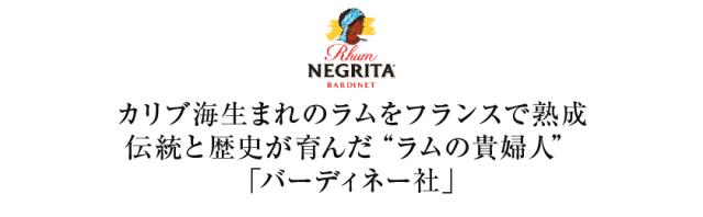 ![]() | 今日、バーディネー社は西インド諸島のマルチニック島などの工場で蒸留したラムの原酒をボルドーに運び、オーク材で作った樽で熟成させて世界中に供給しています。 ネグリタ・ラムの高貴な味わいと豊潤な香りは、フランスの伝統と歴史が育んだ「ラムの貴婦人」の名にふさわしいもの。 フランスでは一二のシェアを争うリーディングブランドであり、世界各国でカクテルや洋菓子作りに欠かせない存在として愛されています。 |