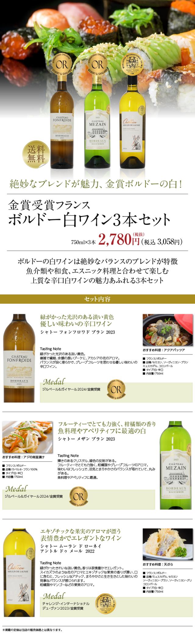 金賞受賞ボルドー白ワインの魅力あふれる3本セットです。