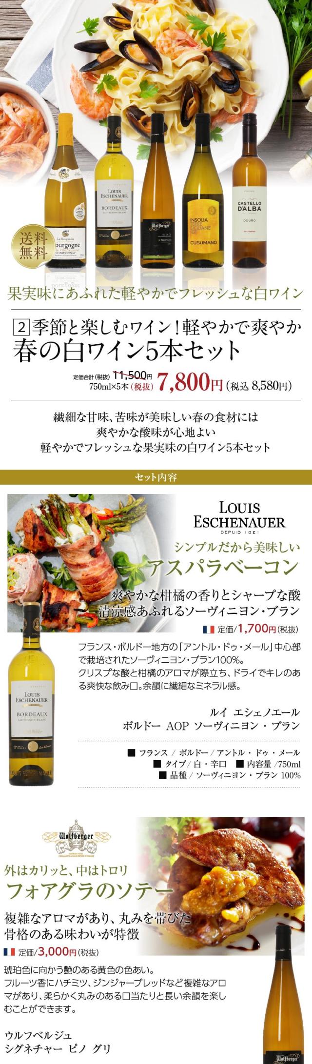 400円OFFクーポン 【2】白ワインセット 季節と楽しむワイン! 春の白ワイン 5本セット 第1弾 750ml×5 送料無料 包装不可 飲み比べ ワインセット