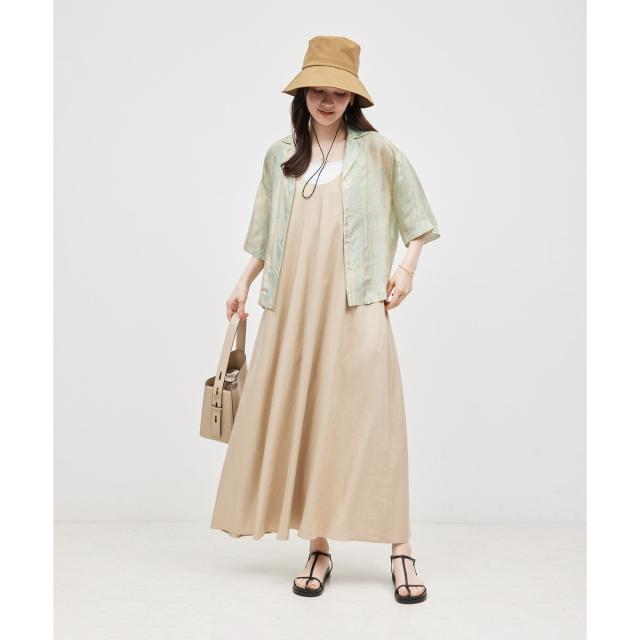 ハーフスリーブの開襟シャツで、短めの着丈ですので、インしなくても決まる着丈感です。きれいめな素材感でゆったりときていただけますので、清涼感があり夏の羽織にぴったりな素材感です。同素材でパンツとワンピースの展開あり。