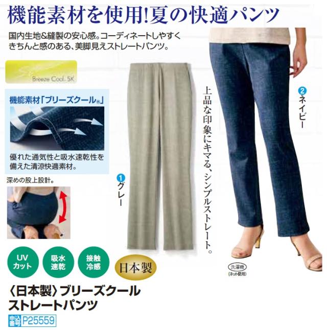 サマーパンツ ストレート レディース 日本製 ブリーズクールストレートパンツ 全2色 婦人服 ミセス シニア 女性 ネイビー グレー 紺色 灰色 無地 吸水速乾 通気性 機能性繊維 シンプル シニアファッション 40代 50代 60代 70代 80代 母の日 お母さん 春夏 fri p25559