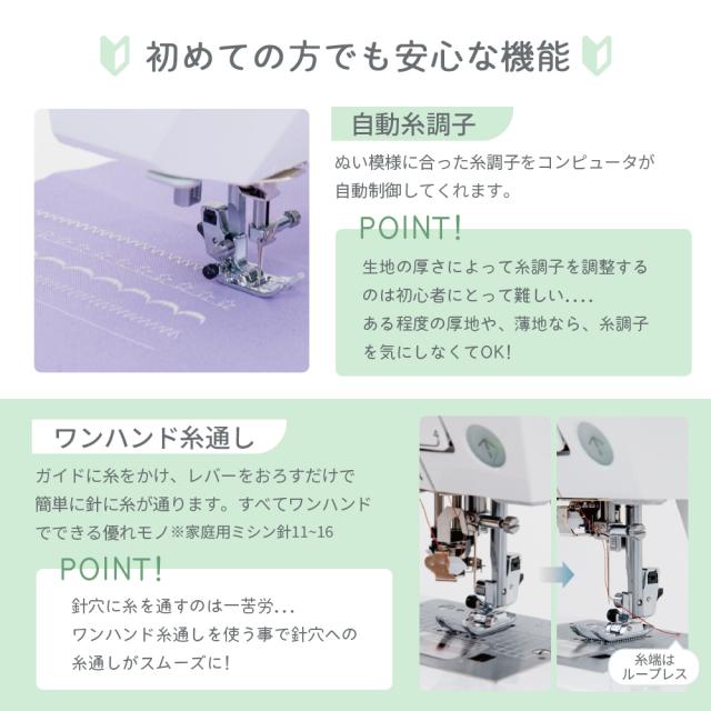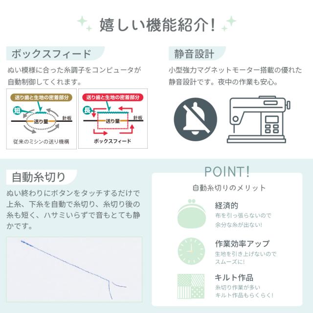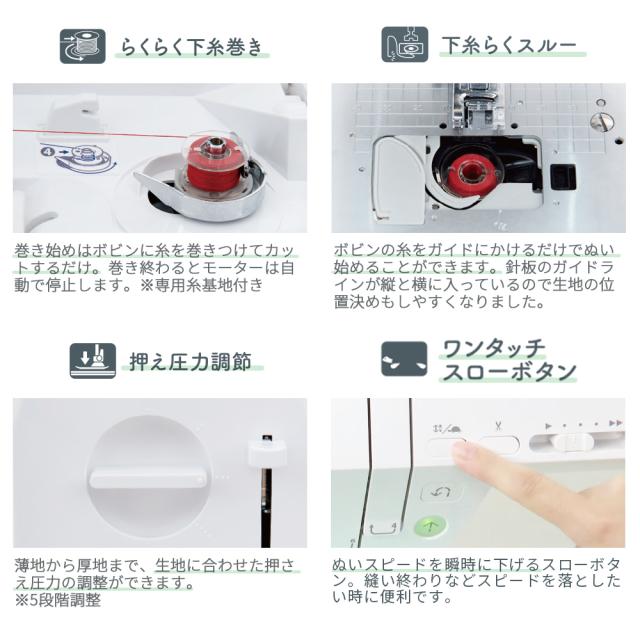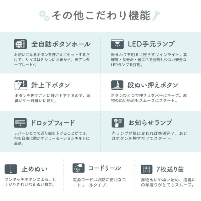 ボックスフィード、ワンハンド糸通し、押え圧力調節、自動糸切り、下糸らくスルー、らくらく下糸巻き、コンピューター式自動糸調子、静音設計、縫い模様30種類、全自動ボタンホール、LED手元ランプ、お知らせランプ、コードリール、ドロップフィード、止縫い、段縫い押えボタン、ワンタッチスローボタン、針上下ボタン、7枚送り歯