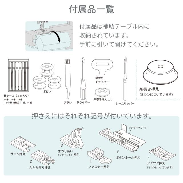 ジグザグ押え、ボタンホール押さえ、ファスナー押え、まつりぬい押え、ふちかがり押え、サテン押え、針ケース、ボビン、ブラシ、ドライバー、針板用ドライバー、糸巻き押え(大)、糸巻き押え(小)シームリッパー