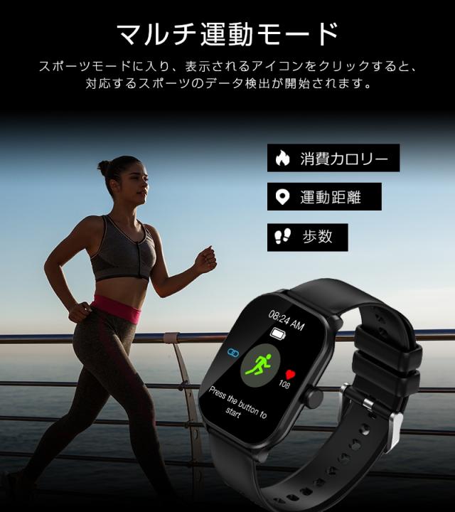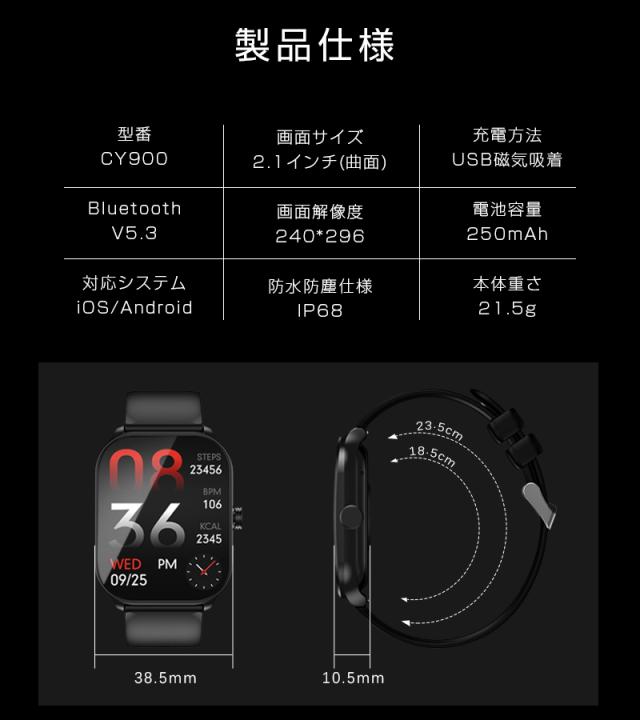 【パッケージ内容】スマートウォッチ本体、充電ケーブル、日本語取扱説明書。