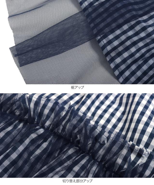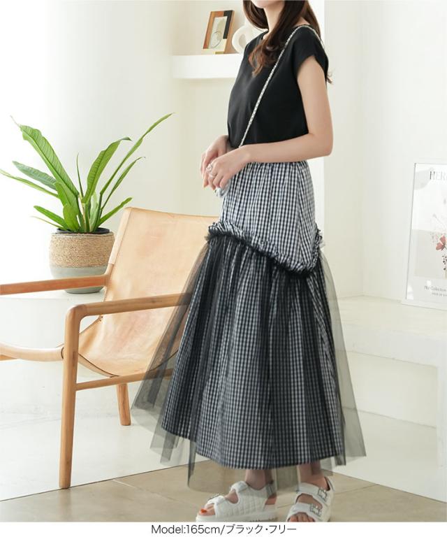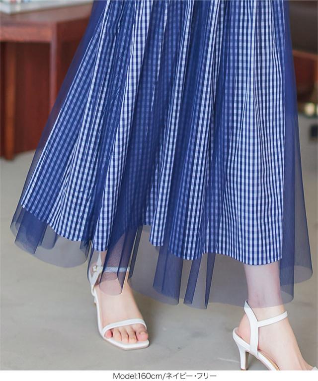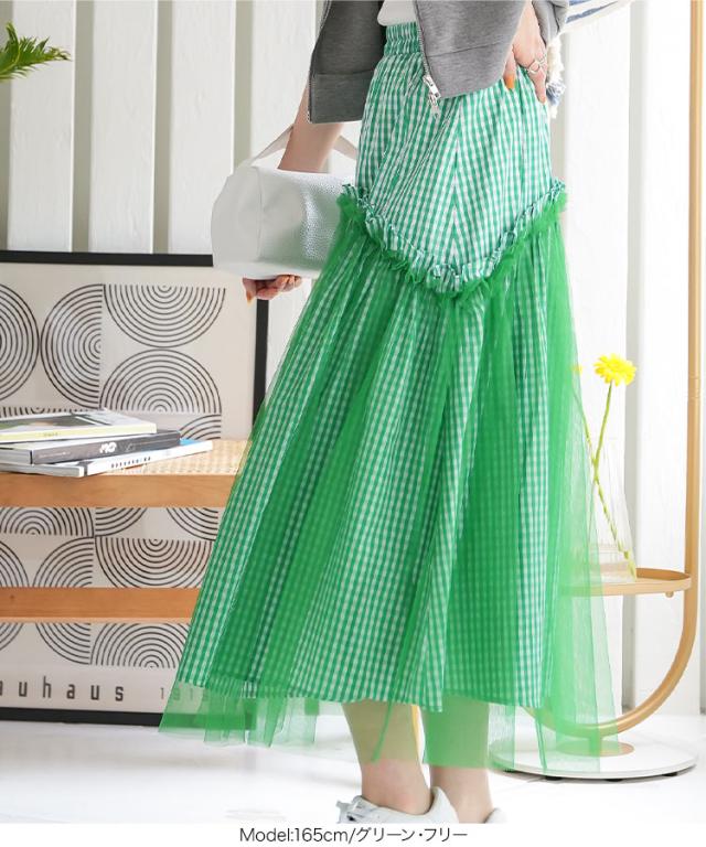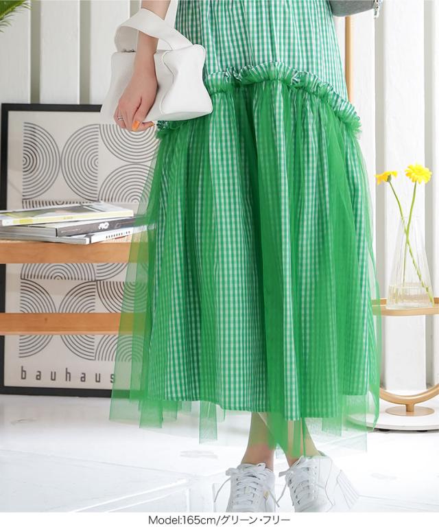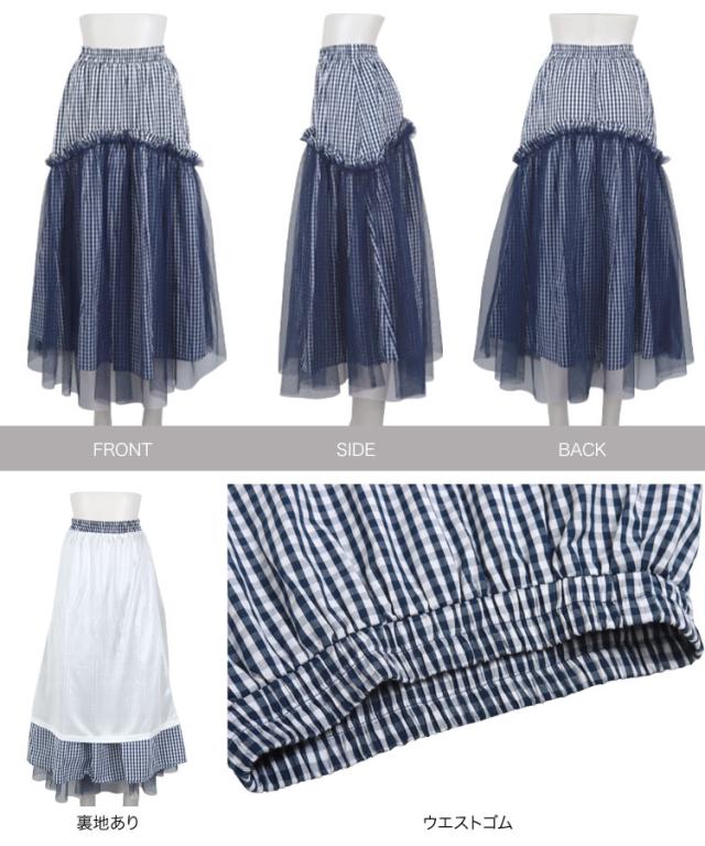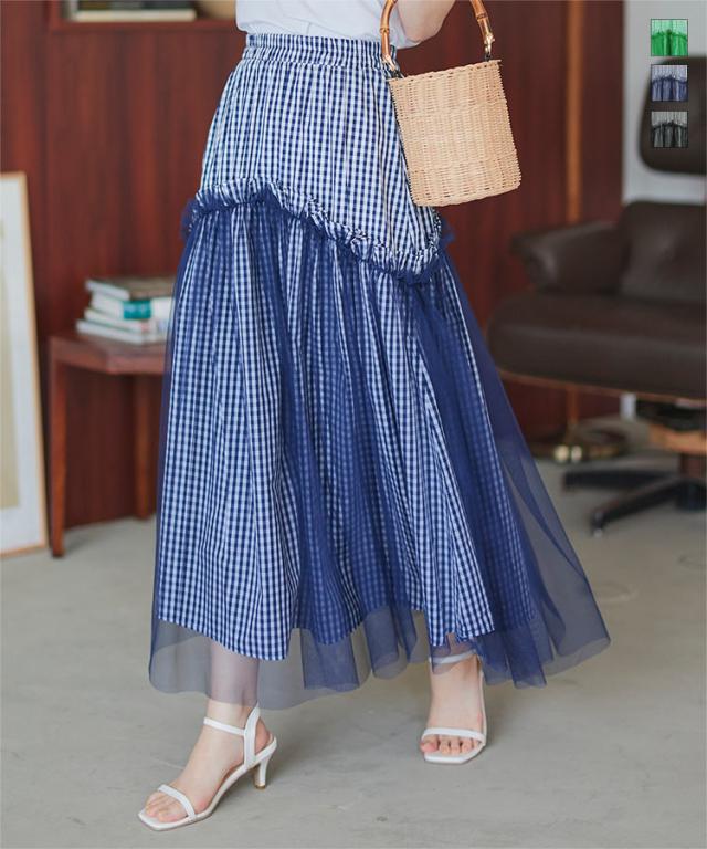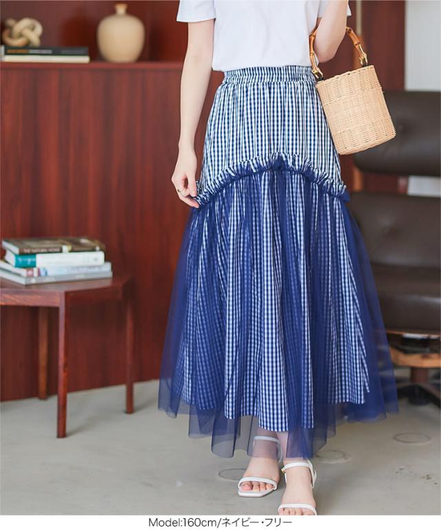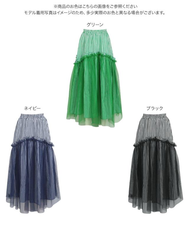 春新作 ティアードチュールギンガムチェックマキシスカート M4082 入荷済 マキシスカート ロングスカート チェック ギンガム チュール バレエコア ティアード フレアスカート ゴム フリー Aライン レディース 30代 40代