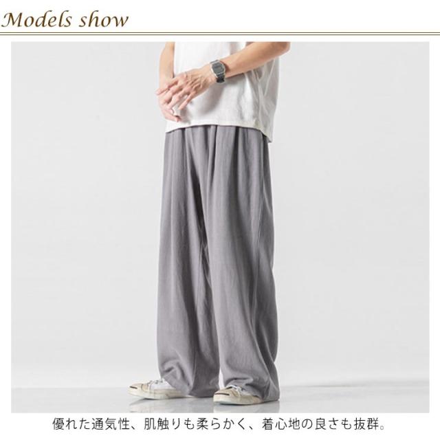 | M−5XL!春夏の定番、ゆったりとした穿き心地のメンズワイドパンツです。 優れた通気性、肌触りも柔らかく、着心地の良さも抜群。 ストンと落ちるデザインでしなやかな着こなしに。 体型を問わずゆったり穿けるシルエットでお洒落に見せられる。 裾にかけてストレートなサイジングにすることにより、コーディネート全体をスマートに魅せてくれる。 お出かけにはもちろん、部屋着やテレワークにもお勧め。 | |