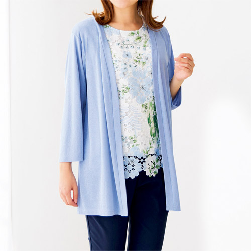 花柄プリントレースで華やぐアンサンブル 全2色 カーディガン カットソー 2点セット レディース 婦人服 ミセス シニア 女性 ブルー ローズピンク 青 赤 上品 フェミニン 半袖 シニアファッション 40代 50代 60代 70代 80代 母の日 お母さん 春夏
