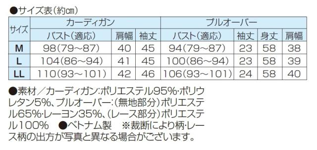 ●素材/カーディガン:ポリエステル95%・ポリウレタン5%、プルオーバー:(無地部分)ポリエステル65%・レーヨン35%、(レース部分)ポリエステル100%