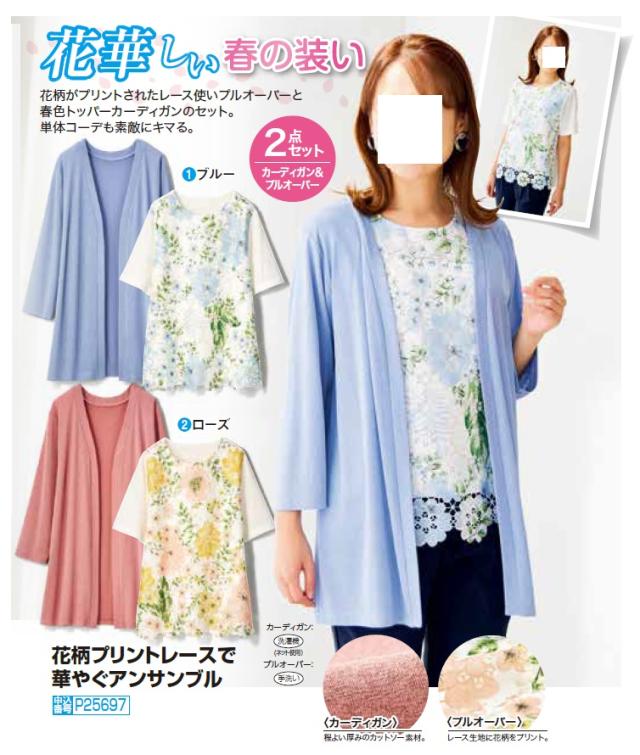 花柄プリントレースで華やぐアンサンブル 全2色 カーディガン カットソー 2点セット レディース 婦人服 ミセス シニア 女性 ブルー ローズピンク 青 赤 上品 フェミニン 半袖 シニアファッション 40代 50代 60代 70代 80代 母の日 お母さん 春夏 fri p25697