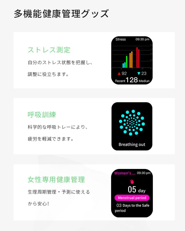 様々な運動モードが搭載、運動時間や距離、カロリーなどのデータが記録できます。また呼吸訓練機能により、科学的な呼吸トレーニングができて、疲労やストレスを軽減できます。