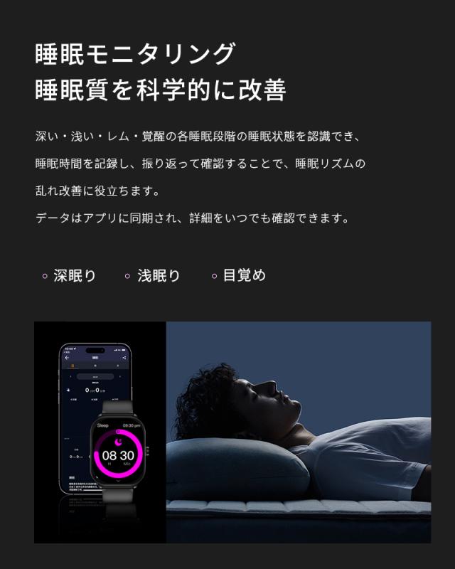 心拍数や血中酸素などを手軽に測定できます。他に睡眠モニタリング、座りがち注意などの機能が搭載され、生活習慣の改善と健康管理をサポートします。