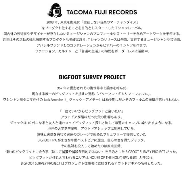 【BIGFOOT SURVEY PROJECT / ビッグフット サーベイ プロジェクト】タコマフジレコードとNANGAの限定コラボT