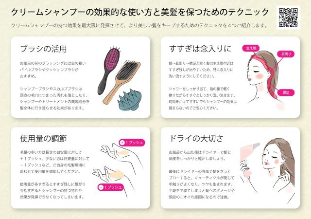予洗いとして頭皮と髪をぬるま湯でしっかりすすぎ、ほこりなどの汚れを洗い流してください。 髪の水気を軽く切り、クリームシャンプーを頭皮と髪全体になじませてから、指の腹を使って頭皮をもみこむようにマッサージしてください。1回の使用量の目安はミディアムヘア(肩につく程度の長さ)で4〜5プッシュです。 頭皮と髪全体を洗ったら、すすぎ残しがないように頭皮と髪をしっかりと洗い流してください。 |