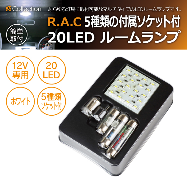 【在庫限】R.A.C 汎用 LEDルームランプ 20LEDタイプ 12V車用 5種類のソケット付き ホワイト発光(商品コード:rm20le)