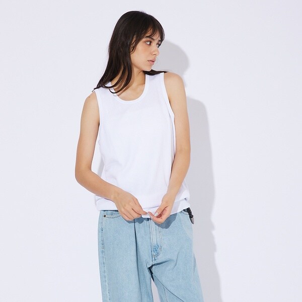 シンプルなデザインながら、素材感がアクセントになったタンクトップ。