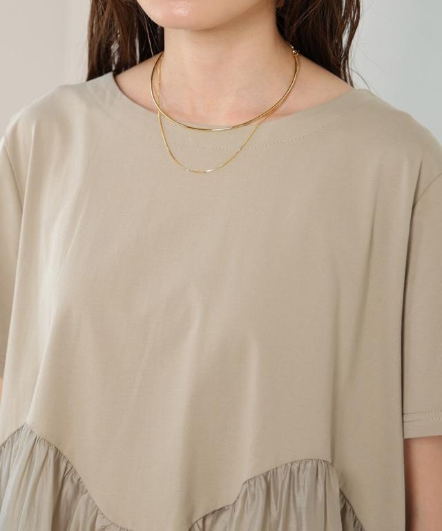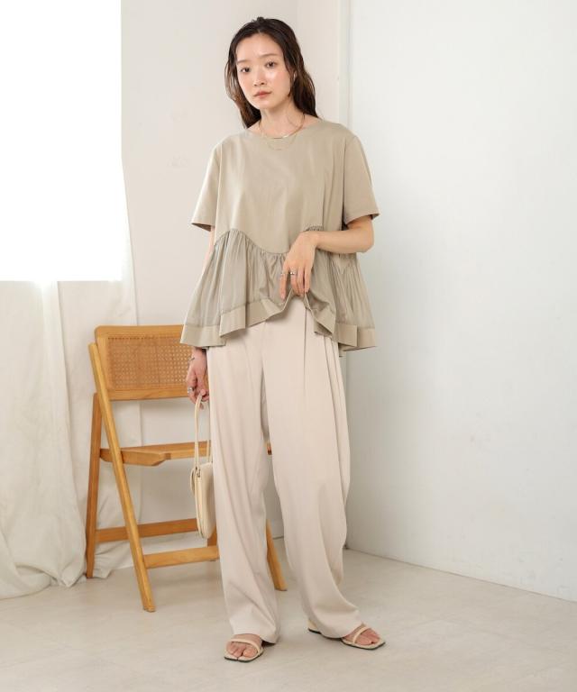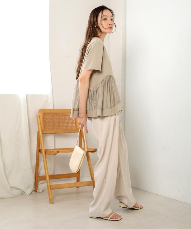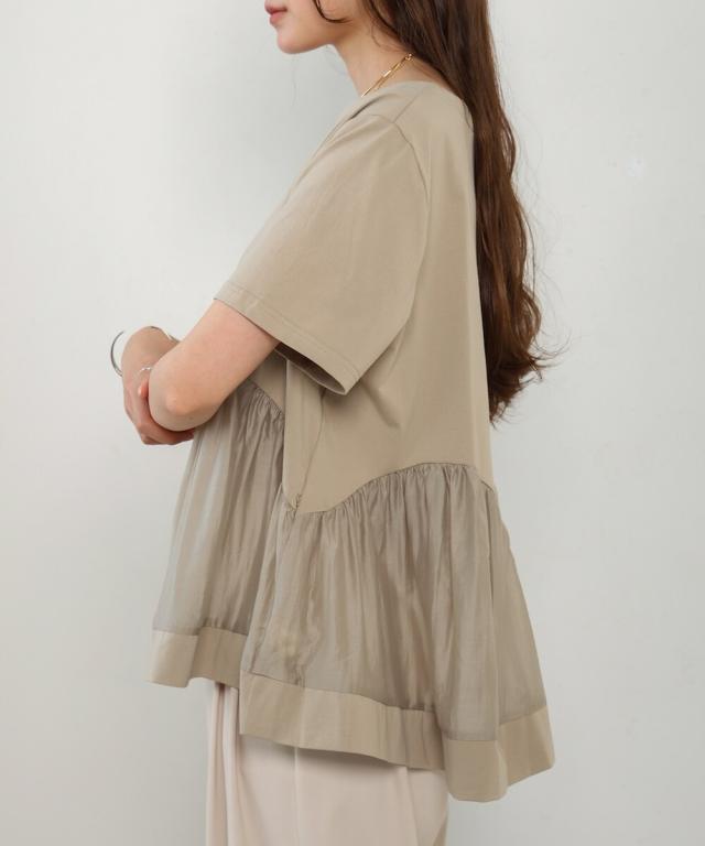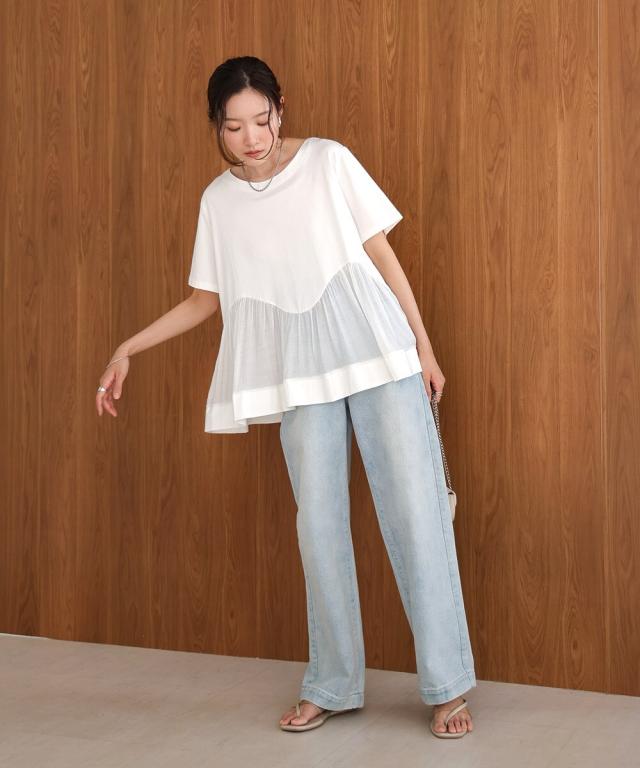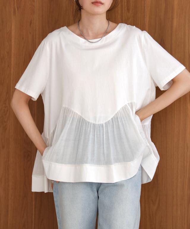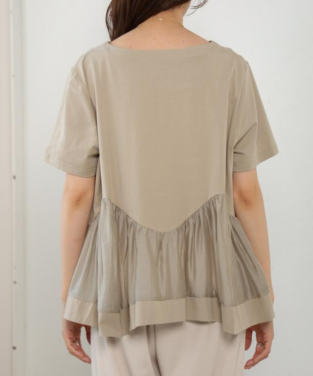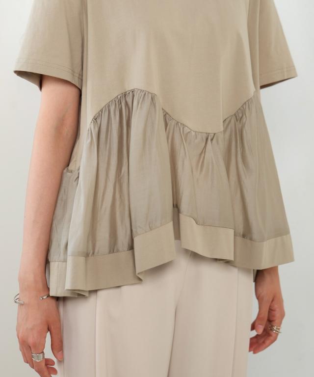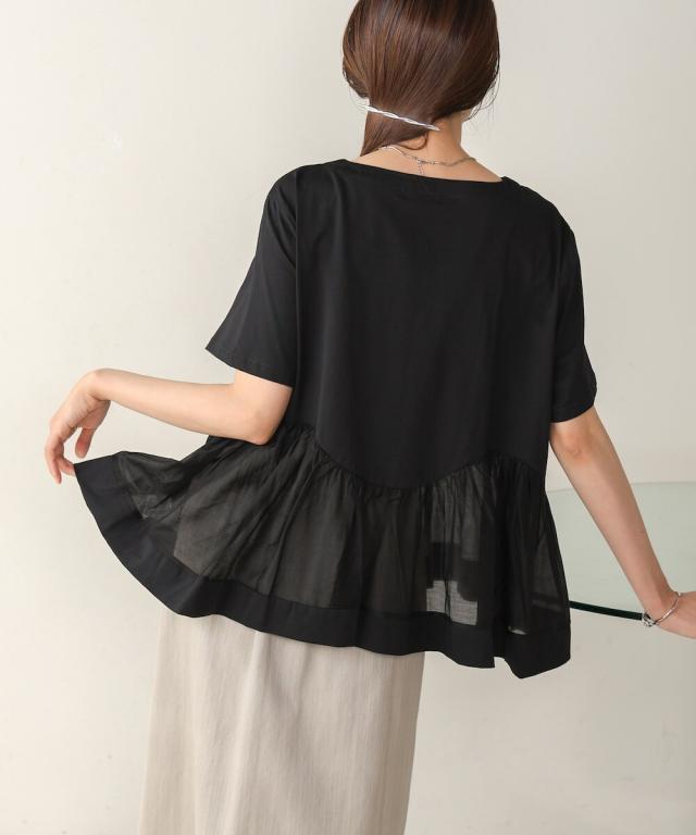 吸湿性のある綿にポリエステルの混紡でしなやかな生地感を実現しました。ペプラム部分はふわっと軽量なシアー素材です。