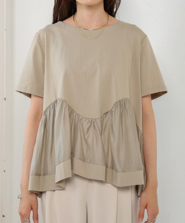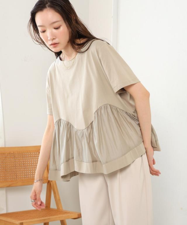 ウェーブ状の切り替えからペプラムデザインになったカットソーです。本体はしなやかな綿混で、切り替えから下は適度な透け感のシアー素材になっており小さなラメがキラキラと輝きます。ゆったりめのサイジングでボディラインを気にせずお召し頂け、ペプラムでウエストの華奢見えも期待できます。浅めのネックと二の腕をカバーする袖丈で上品な雰囲気もかなえてくれます。