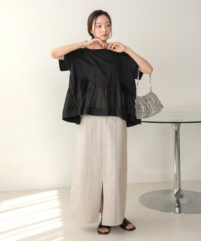 切り替えから下がフレアシルエットなので、タイトスカートやストレートパンツなど落ち感の良いボトムスが相性◎!カジュアルからきれいめまで、テイストを選ばず着回しが出来ます。