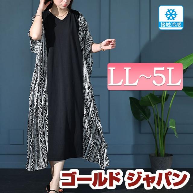 春新作 大きいサイズ レディース ワンピース 接触冷感エスニック柄切り替えワンピース ワンピ ロングワンピース ロング 5分袖 ドルマン 接触冷感 ひんやり Vネック エスニック柄 切り替え ポケット マタニティ 春服 夏服 秋服 LL 2L 3L 4L 5L ブラック 黒 ゴールドジャパン