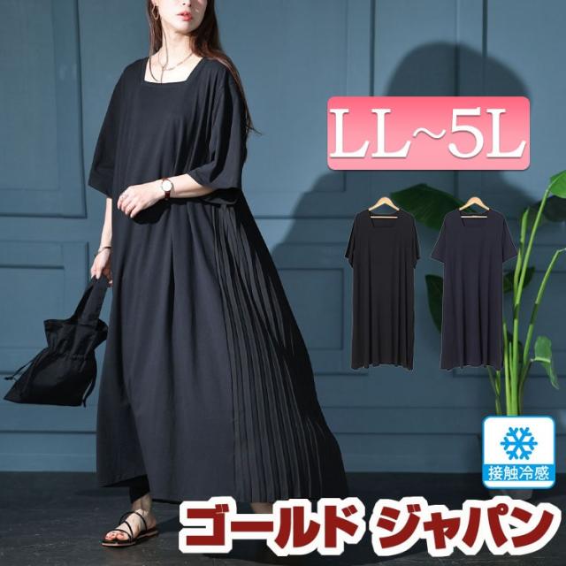 春新作 大きいサイズ レディース ワンピース 接触冷感バックプリーツワンピース ワンピ ロングワンピース ロング 5分袖 プリーツ 接触冷感 ひんやり スクエアネック フレア ストレッチ マタニティ 春服 夏服 秋服 LL 2L 3L 4L 5L ブラック 黒 ネイビー ゴールドジャパン