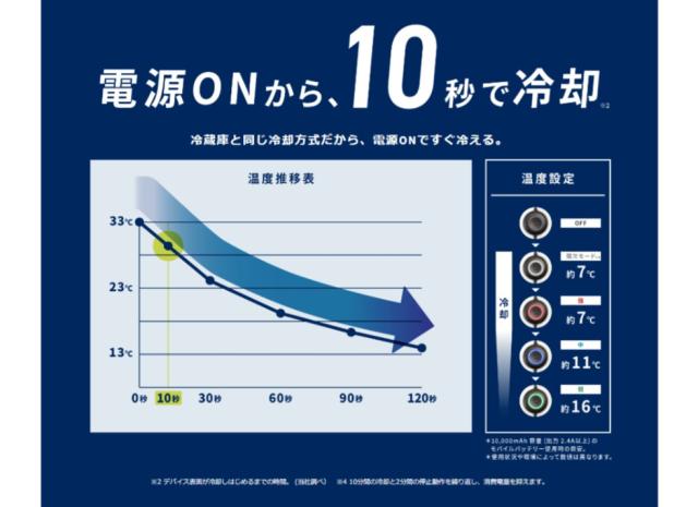 冷蔵庫と同じ冷却方法だから、電源ONですぐに冷える。