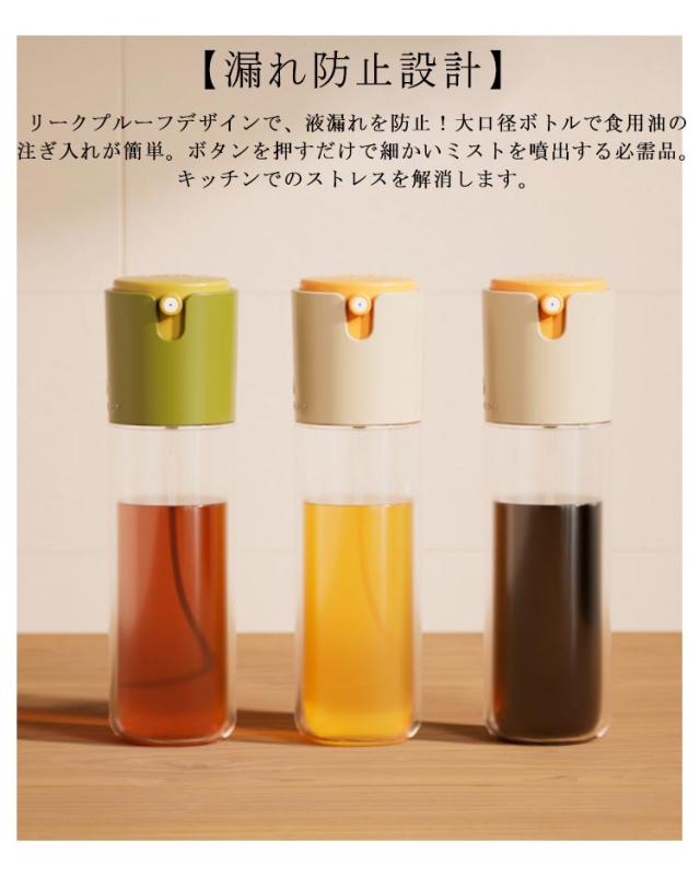 | 極細のミスト! 霧吹き&注ぐ2WAYタイプのオイルスプレー 300ml 【均一な霧】 料理に必要な油の量を正確にコントロール!オイルの量をコントロールするあらゆるレシピに適しています。清潔でこぼれにくい超ロングノズルが、料理をより簡単にします。シェフやグルメに愛され、より健康的な料理を作ることができます。 【便利な自動開閉式】 傾けると自動的にフタが開くので、フタを開け閉めする必要がありません。垂直にするとフタが自動で閉まります。 【透明なガラス製】 残量チェックがラクラク!プラスチックよりも変形しにくく、有害物質が出にくい安心のガラス製。人間工学に基づいたデザインで、使いやすさと煩わしさを感じさせません。底に少なくなったオイルもしっかり吸引! 【漏れ防止設計】 リークプルーフデザインで、液漏れを防止!大口径ボトルで食用油の注ぎ入れが簡単。ボタンを押すだけで細かいミストを噴出する必需品。キッチンでのストレスを解消します。 【使いやすい】 スプレーボトルを押すだけで、細かいミストが広がります。失敗知らずの料理に!均一なミストで油の過剰使用を回避し、おいしい料理を楽しめます。 広く使われています 【持ち運びにも便利】 容器本体はガラスになっていて、空気圧を入れるポンプの役割の蓋とスプレー箇所の2つのパーツに分かれていて、シンプルでとてもおしゃれです。漏れにくい構造になっているので、携帯するのにも便利ゆでたパスタやサラダ、BBQなど、外でも活用できます。 | |