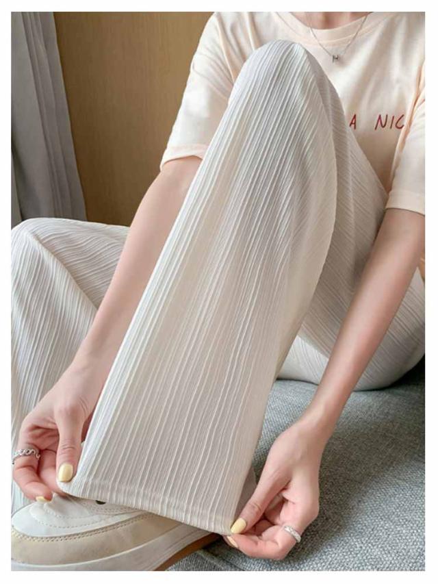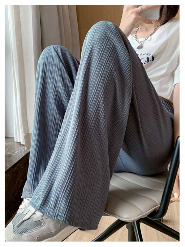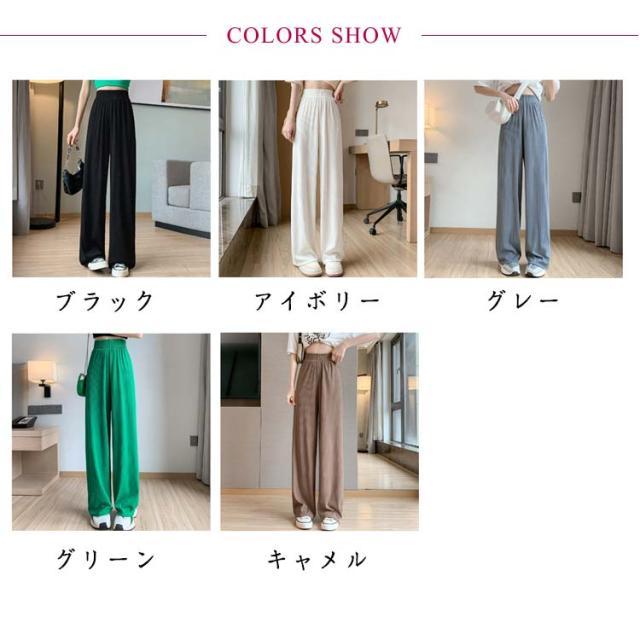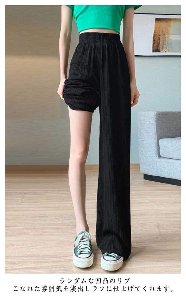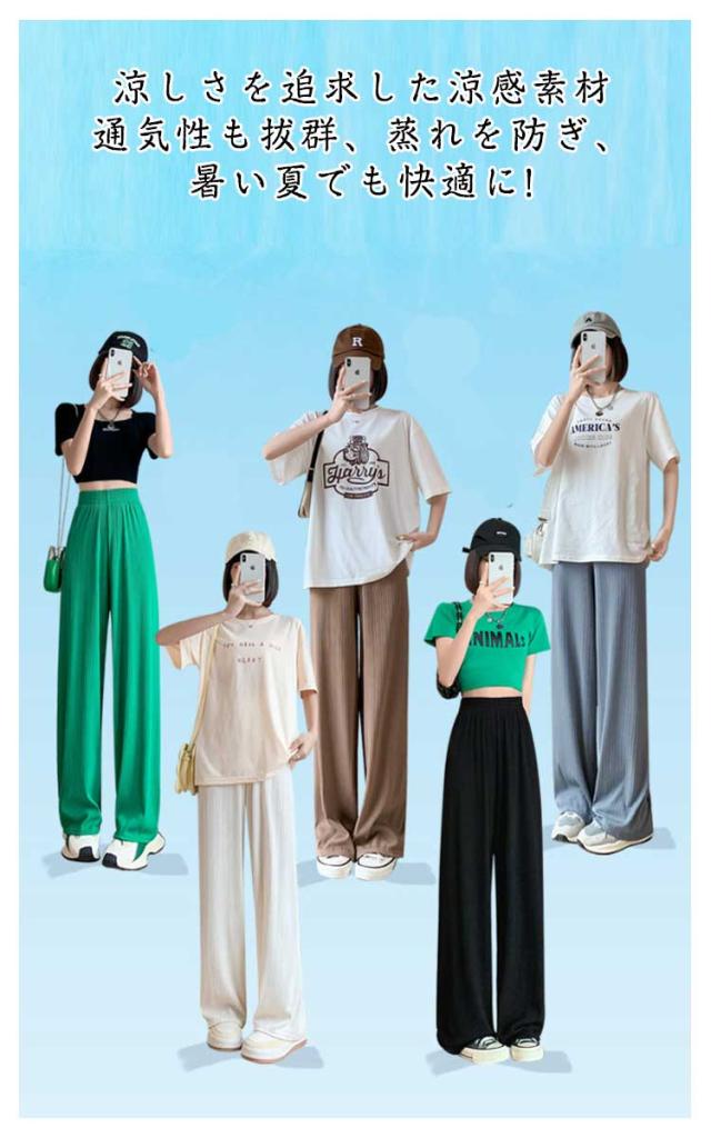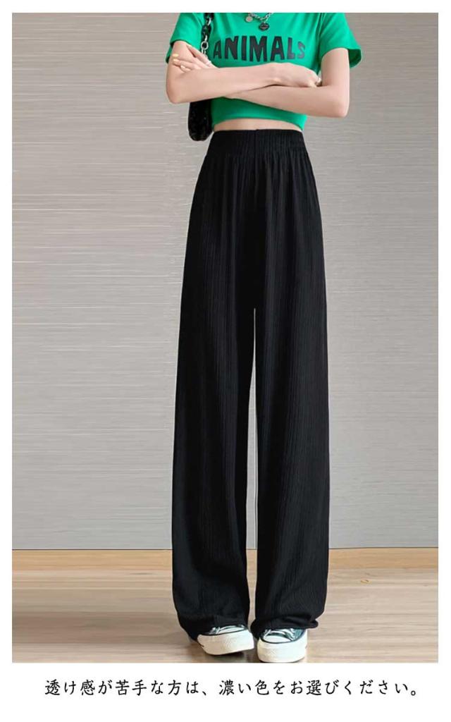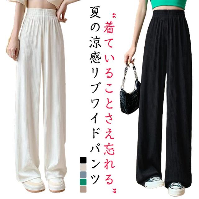 レディース プリーツ リブ イージーパンツ アイスシルクパンツ ボトムス ロングパンツ ワイドパンツ ワイドパンツ 夏 冷感 ひんやり 通気性 楽ちん ゆったり パンツ 高身長 低身長 ウエストゴム 無地 シンプル きれいめ カジュアル 涼しい 落ち感