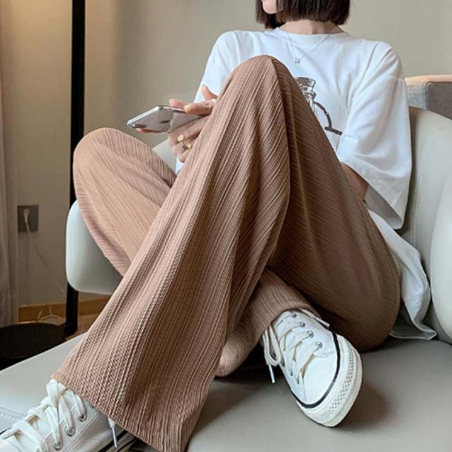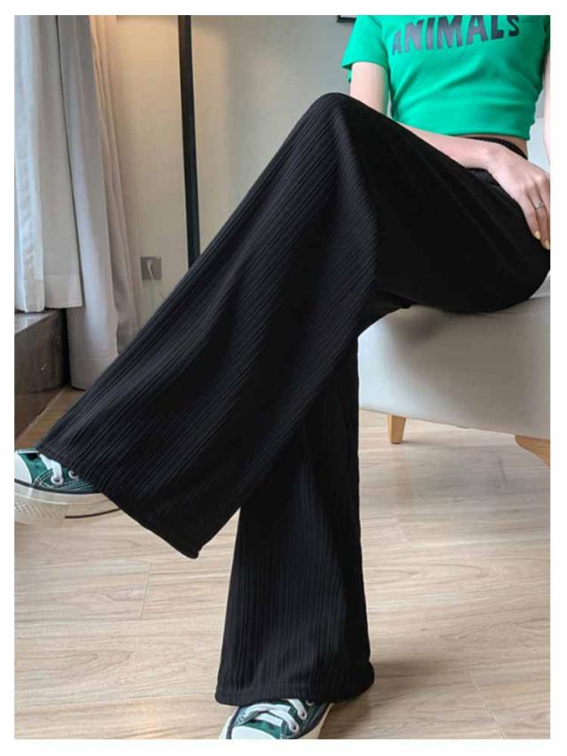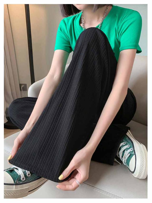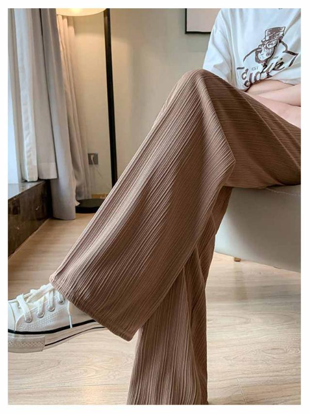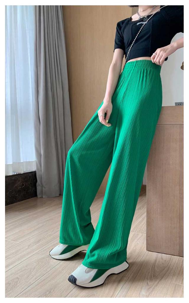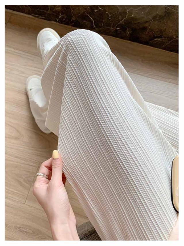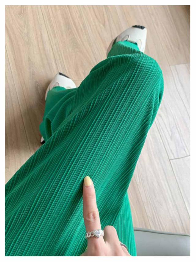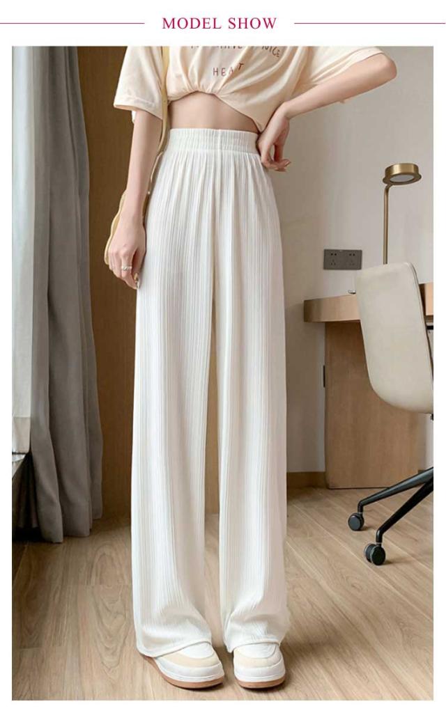 レディース プリーツ リブ イージーパンツ アイスシルクパンツ ボトムス ロングパンツ ワイドパンツ ワイドパンツ 夏 冷感 ひんやり 通気性 楽ちん ゆったり パンツ 高身長 低身長 ウエストゴム 無地 シンプル きれいめ カジュアル 涼しい 落ち感