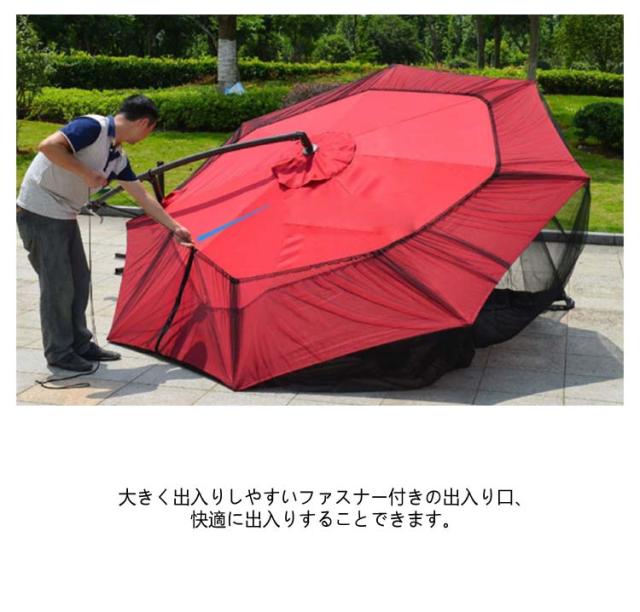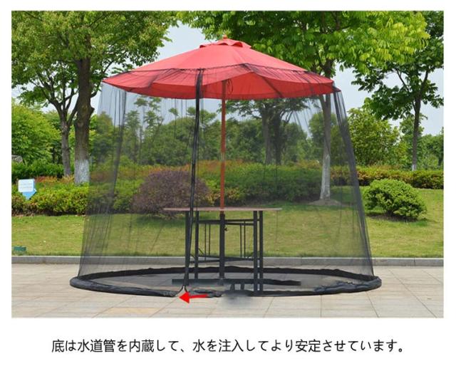 | パラソルの上にかぶせるだけで、蚊の侵入を防ぐことができます。 蚊帳の上部は、巾着の口のような設計で、紐だけでサイズを調整できます。 細かいメッシュ生地は、風通しが良くて、視界を妨げません。 大きく出入りしやすいファスナー付きの出入り口、快適に出入りすることできます。 底は水道管を内蔵して、水を注入してより安定させています。 折り畳み式のデザイン、屋外や旅行などを簡単に持ち運びできます。 | |