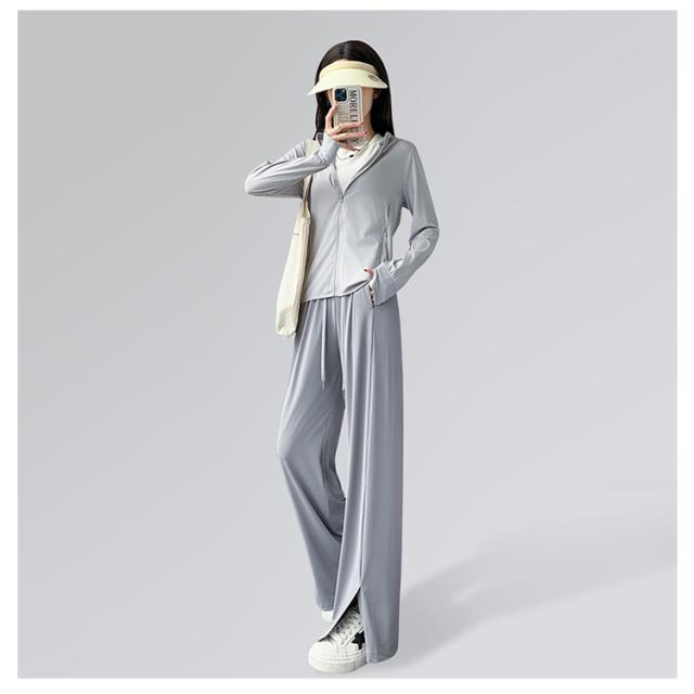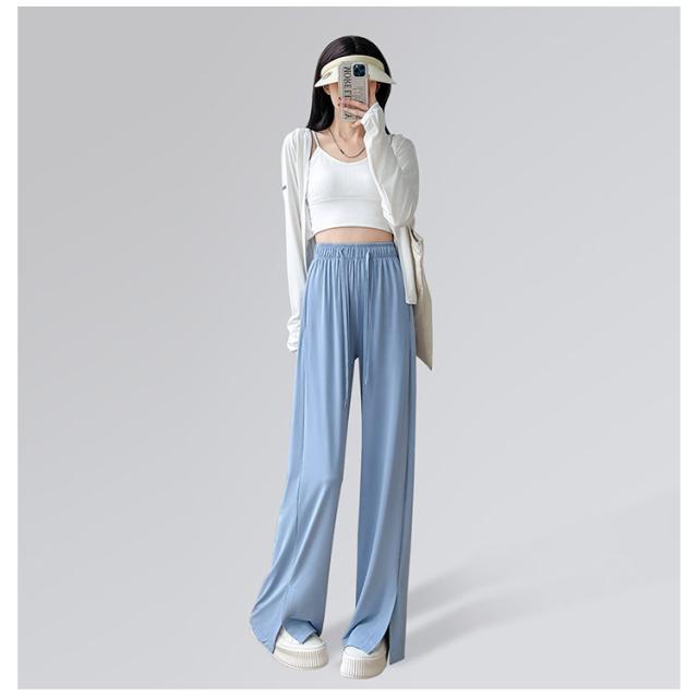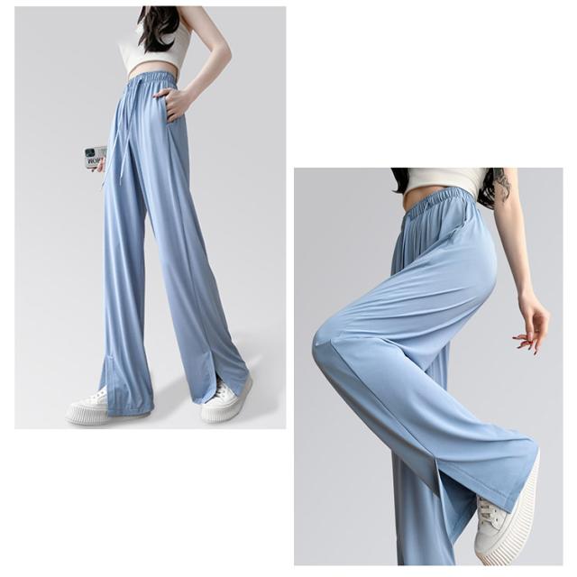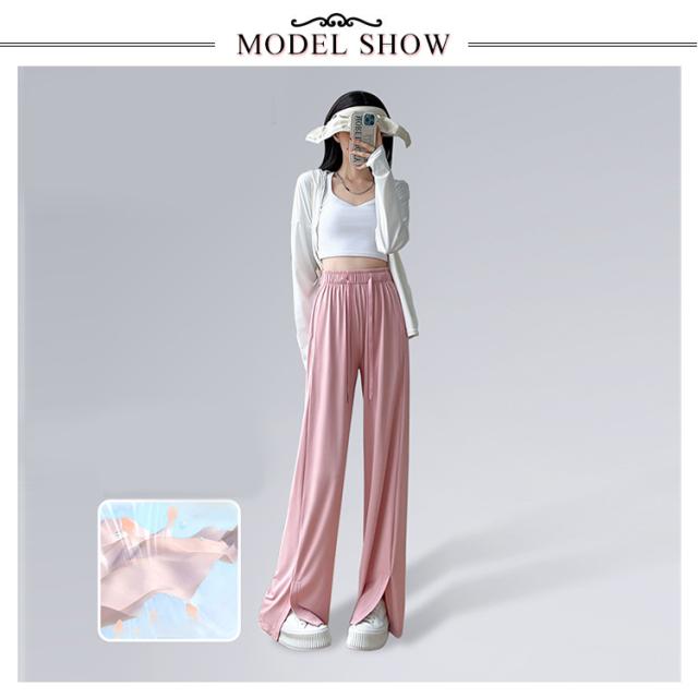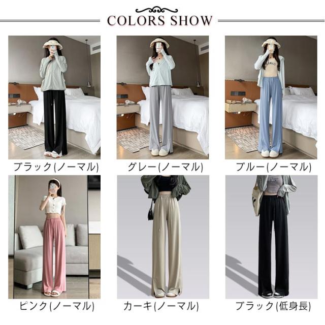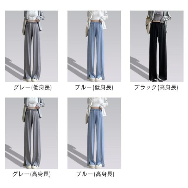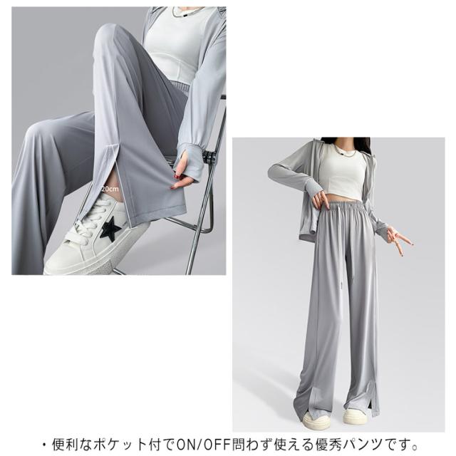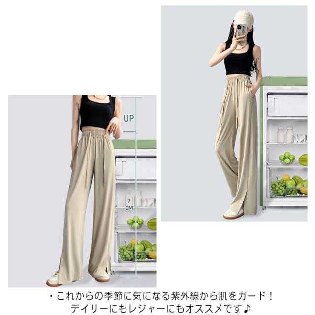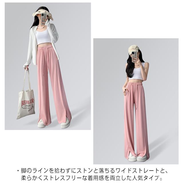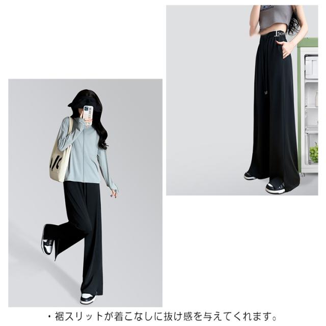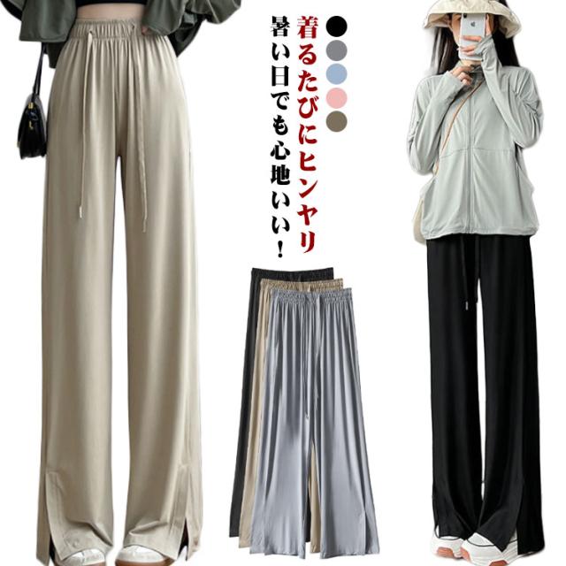 薄手 涼しい ワイドパンツ レディース 冷感 ストレートパンツ 裾スリット ワイドパンツ イージーパンツ きれいめ ポケットあり 紐付き ウェストゴム ストレッチ ひんやり 通気 速乾 カジュアル ズボン ロング丈 選べる着丈