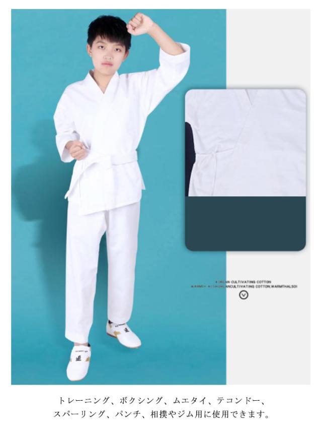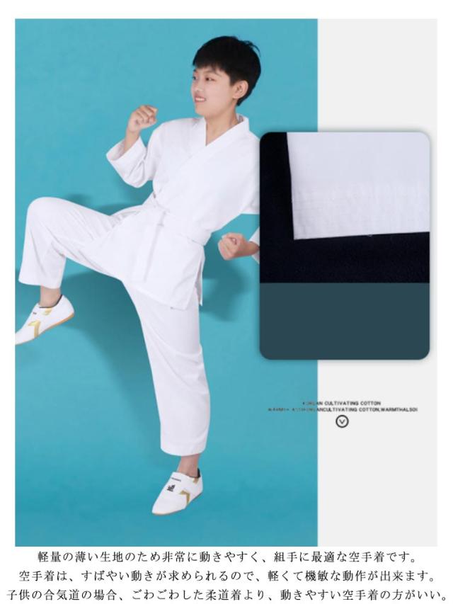 | 上下+帯の空手着3点セット! 綿混生地で乾きやすい、耐久性も十分です。 軽量の薄い生地のため非常に動きやすく、組手に最適な空手着です。空手着は、すばやい動きが求められるので、軽くて機敏な動作が出来ます。子供の合気道の場合、ごわごわした柔道着より、動きやすい空手着の方がいい。 トレーニング、ボクシング、ムエタイ、テコンドー、スパーリング、パンチ、相撲やジム用に使用できます。 初心者におすすめです。初心者、小学生、中高生、道場練習用! | |