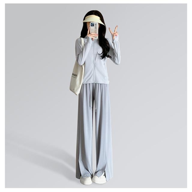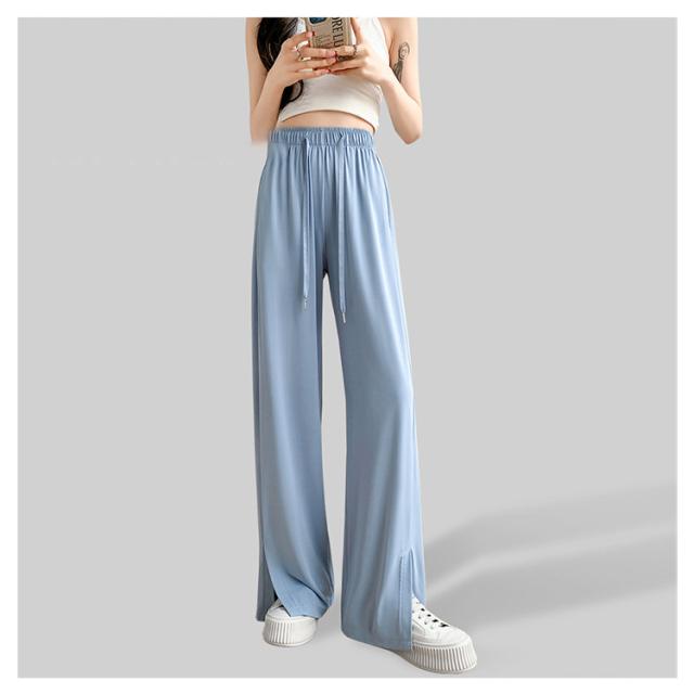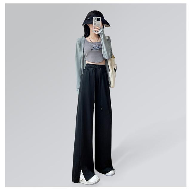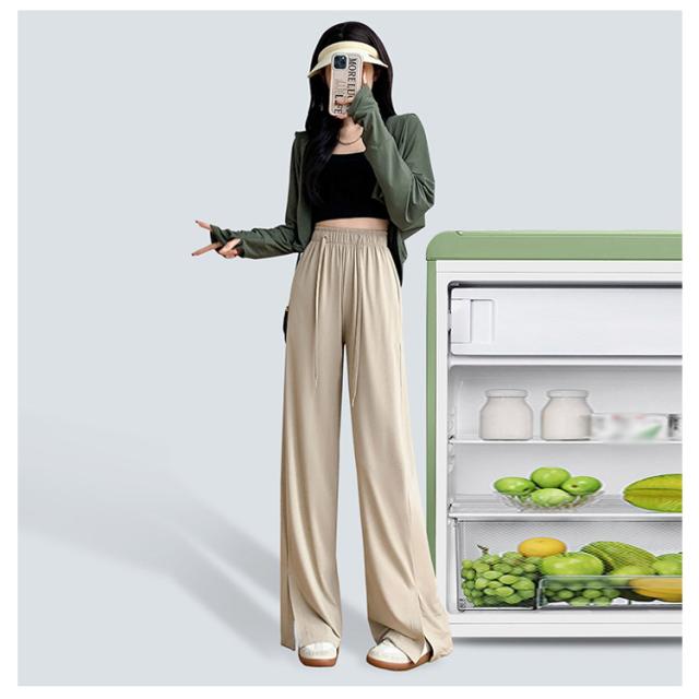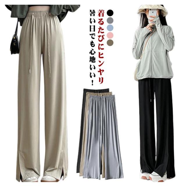 ワイドパンツ 冷感 パンツ レディース ひんやり 涼しい 裾スリット ストレートパンツ イージーパンツ きれいめ ポケットあり 紐付き ウェストゴム ストレッチ 薄手 通気 速乾 カジュアル ズボン ロング丈 選べる着丈 夏