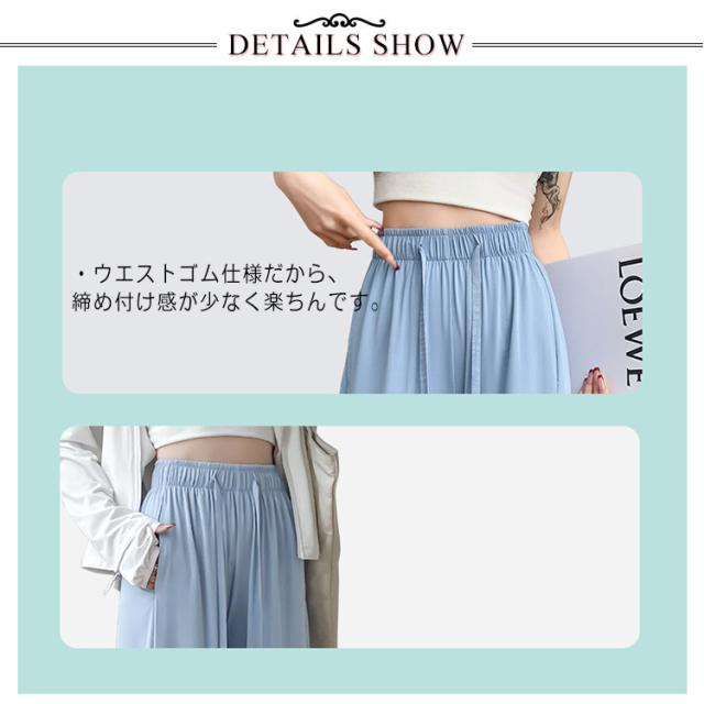 | ・着るたびにヒンヤリ暑い日でも心地いい! ・脚のラインを拾わずにストンと落ちるワイドストレートと、柔らかくストレスフリーな着用感を両立した人気タイプ。 ・裾スリットが着こなしに抜け感を与えてくれます。 ・ウエストゴム仕様だから、締め付け感が少なく楽ちんです。 ・便利なポケット付でON/OFF問わず使える優秀パンツです。 ・これからの季節に気になる紫外線から肌をガード!デイリーにもレジャーにもオススメです♪ | |