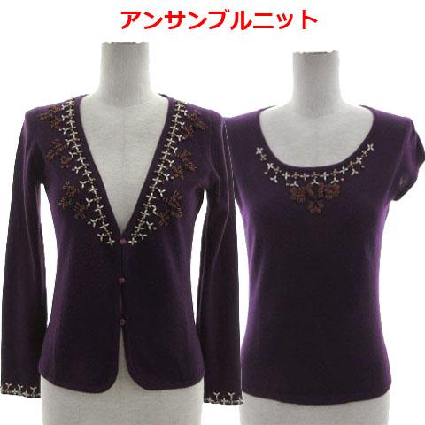 【中古】オペーク OPAQUE アンサンブルニット ビーズ ビジュー カーディガン 長袖 ニット フレンチスリーブ ウール 紫